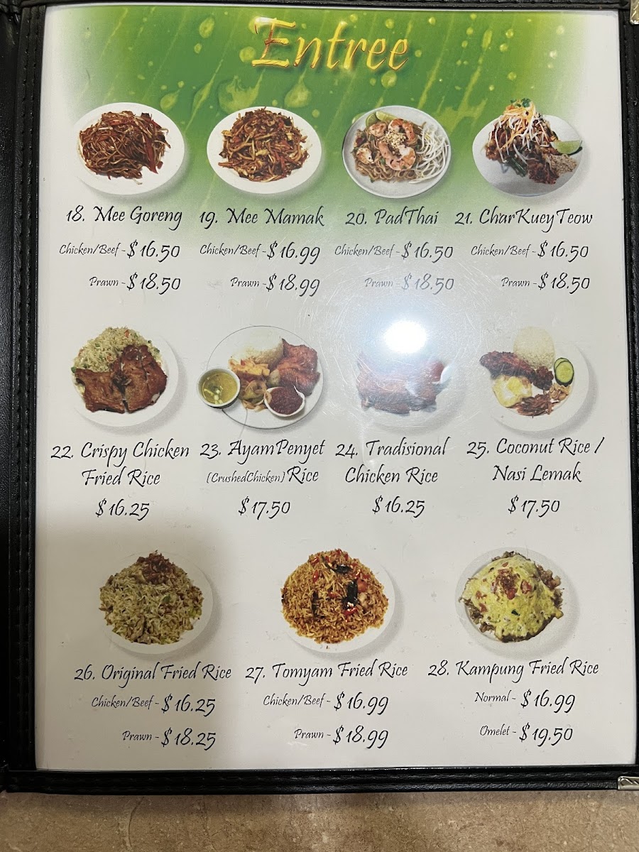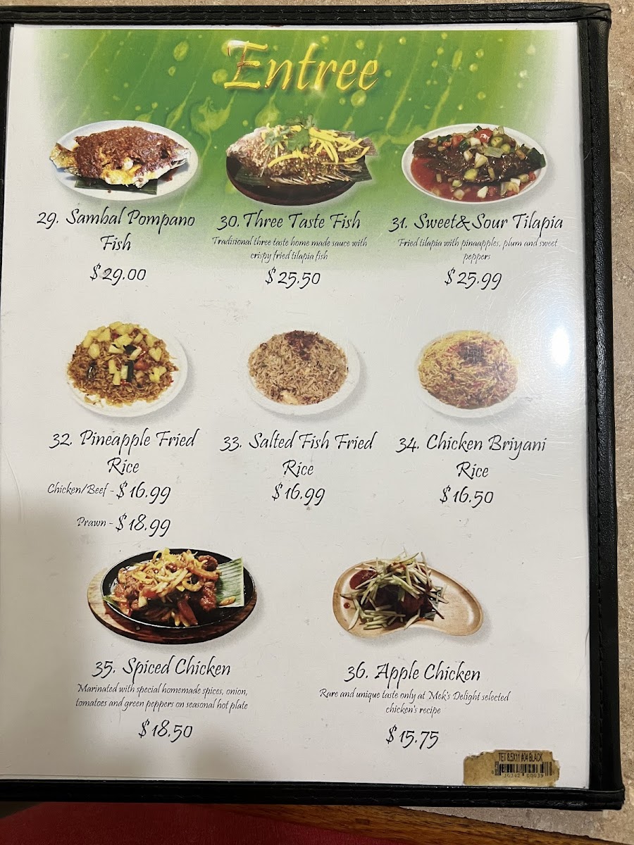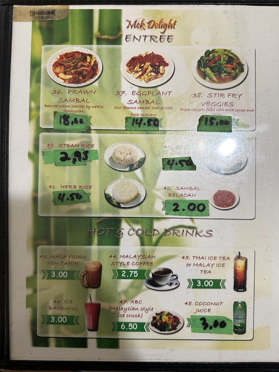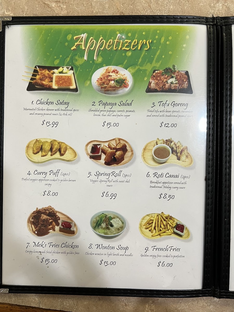 Mek's Delight offers a delightful array of flavorful dishes that showcase the rich culinary traditions of Southeast Asia. For those craving something spicy and aromatic, the Laksa is a must-try, with its bold combination of noodles, coconut milk, and a kick of heat. Pair it with a refreshing Malaysian Tea to balance out the heat and enjoy a taste of authentic Malaysian beverages. The Char Kwey Teow, a classic stir-fried noodle dish, is another standout, offering a smoky, savory flavor profile that is perfect for those looking for a more traditional taste. For a unique twist on a sweet and tangy drink, the Air Bandung is an excellent choice, providing a delightful rose syrup flavor that is perfectly paired with the savory dishes. Mek's Delight also excels in offering comfort food, with the Salted Fish Fried Rice and Egg Fried Rice, both dishes providing a satisfying and hearty option for any diner. Finally, the Crispy Chicken Fry stands out for its perfectly crispy exterior and juicy interior, making it a favorite for chicken lovers. Whether you're indulging in the bold flavors of Southeast Asia or simply enjoying a comforting fried rice, the menu at Mek's Delight is packed with diverse, flavorful options that are sure to please any palate.